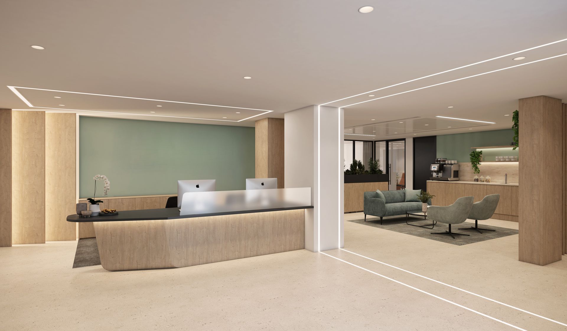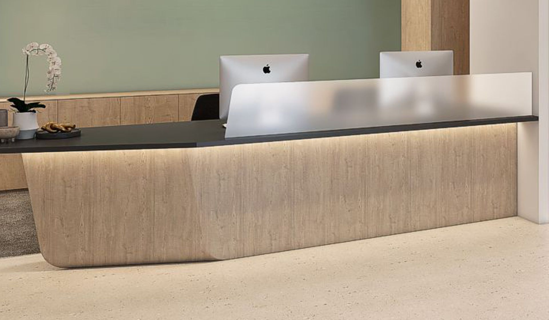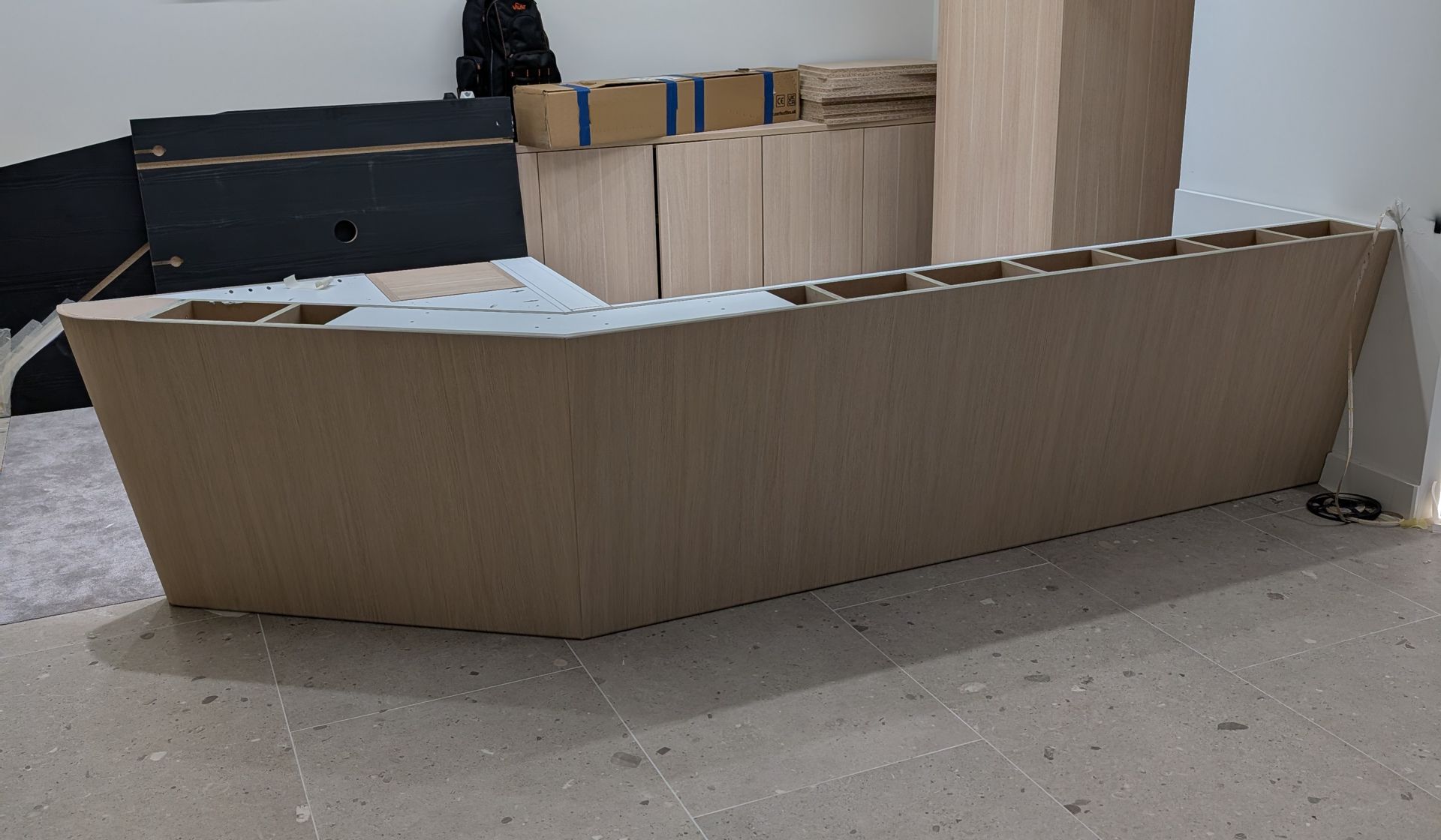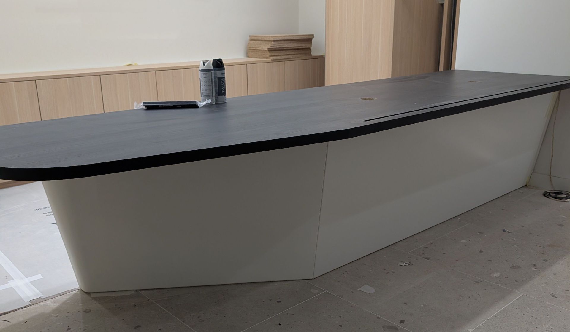 The bespoke reception desk had an asymmetric, off-centre angle that made it difficult to finish using standard wood veneers or materials. The carpentry team, while highly skilled, needed a solution that would retain the desk’s clean geometry without compromising the aesthetic — and traditional joinery just couldn’t deliver the seamless finish required.